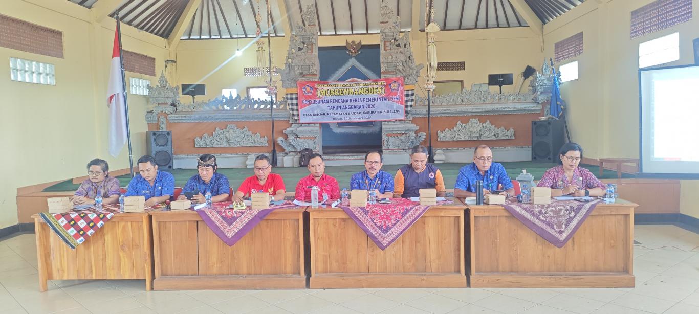 Pemerintah Desa Banjar - Bertempat di Bale Sabha Desa Kertha Locitta Desa Adat Banjar, dilaksanakan MUSRENBANG Penyusunan Rencana Kerja Pemerintah Desa Tahun Anggaran 2026. Musyawarah di buka langsung oleh Perbekel Banjar Ida Bagus Dedy Suyasa dan dilanjutkan arahan dari Dinas Lingkungan Hidup Kabupaten Buleleng, Dinas Sosial Kabupaten Buleleng, BPBD Kabupaten Buleleng dan Dinas Perumahan dan Pemukiman Kabupaten Buleleng, acara berjalan dengan lancar dan di tutup dengan pembentukan Tim Delegasi yang akan mewakili Desa Banjar untuk Musrenbang di Kecamatan.