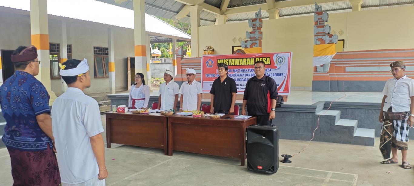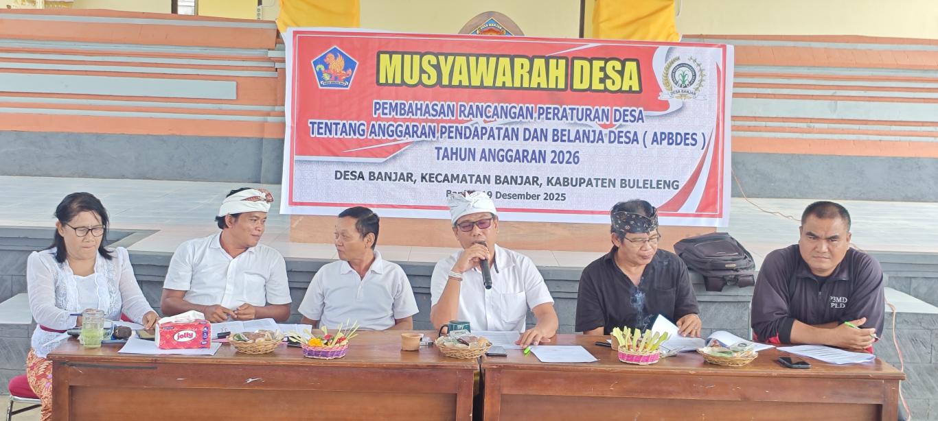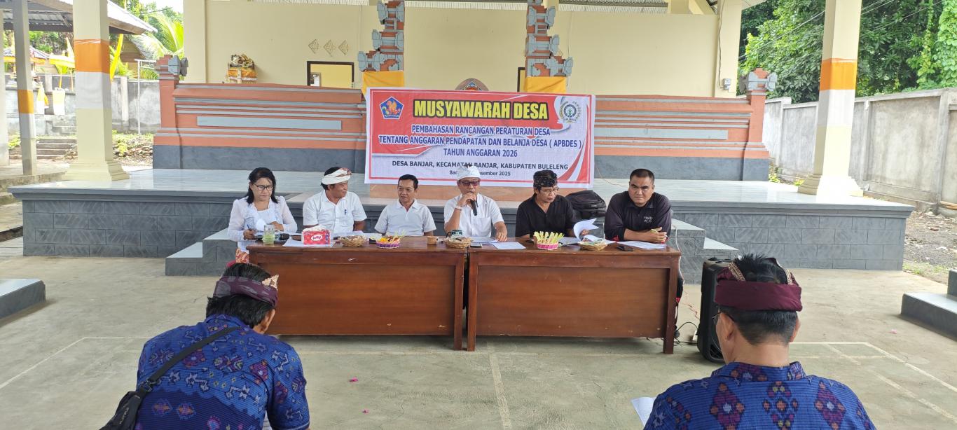 Pemerintah Desa Banjar - Bertempat di Wantilan Kantor Perbekel Banjar dilaksanakan Musyawarah Desa Pembahasan Rancangan Peraturan Desa Tentang Anggaran Pendapatan Dan Belanja Desa (APBDES) Tahun Anggaran 2026, kegiatan kali ini di pimpim langsung oleh Wakil Ketua BPD Putu Satia Ananda dan di hadiri oleh Perbekel Banjar Ida Bagus Dedy Suyasa, Camat Banjar yang diwakili oleh Kasi Pemerintahan I Gst Bagus Nyoman Sarpa Wijaya, SE, Ketua Koperasi Merah Putih Desa Banjar, Anggota BPD, Perangkat Desa, Pendamping Lokal Desa, Babinkamtibnas Desa Banjar, Perwakilan Kelompok Tani Ternak se Desa Banjar, dan Perwakilan Masyarakat Miskin.