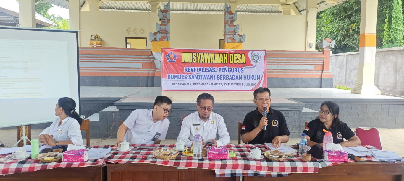 Pemerintah Desa Banjar - Pemerintah Desa Banjar bersama Badan Pemusyawaratan Desa (BPD) Desa Banjar melaksanakan Musyawarah Desa (Musdes) Laporan Pertanggung Jawaban (LPJ) BUMDES Sanjiwani Dan Revitalisasi Pengurus BUMDES Sanjiwani Berbadan Hukum, Bertempat di Wantilan Kantor Perbekel Banjar Musdes kali ini di buka oleh Wakil BPD Putu Satia Ananda, dilanjutkan dengan Sambutan dari Perbekel Banjar Ida Bagus Dedy dan dilanjutkan oleh Camat Banjar atau yang mewakili, dilanjutkan dengan Penyampaian Laporan Pertanggung Jawaban oleh Pengurus Lama BUMDES sanjiwani, seusai penyampaian Laporan Pertanggung Jawaban (LPJ) oleh Pengurus BUMDES Sanjiwani yang lama dilanjutkan dengan penyerahan Laporan Pertanggung Jawaban (LPJ) dari pengurus BUMDES Sanjiwani ke Perbekel Desa Banjar. Setelah selesainya Musyawarah Desa Laporan Pertanggung Jawaban (LPJ) dilanjutkan dengan Musyawarah Desa Revitalisasi Pengurus BUMDES Sanjiwani Berbadan Hukum dengan agenda Pemilihan Pengurus dan Pengawas BUMDES Sanjiwani, adapun Pengurus yang terpilih adalah