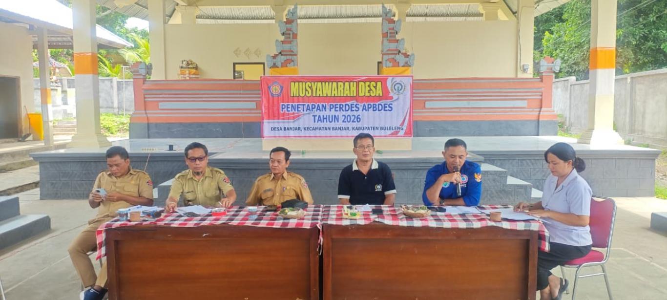 Pemerintah Desa Banjar - Bertempat di Wantilan Kantor Perbekel Banjar, Pemdes Banjar melaksanakan Musyawaran Desa Penetapan PERDES APBDES Tahun 2026 dan Musyawarah Desa Penetapan PERDES Penyertaan Modal BUMDES Sanjiwani, kegiatan kali ini dibuka langsung oleh Seketaris Desa I Made Suarjana dan di hadiri oleh Perbekel Banjar Ida Bagus Dedy Suyasa, Camat Banjar yang di wakili oleh Kasi Pemerintahan I Gusti Bagus Nyoman Sarpa Wijaya,SE, dihadiri juga oleh BPD Desa Banjar, Pendamping Lokas Desa dan Pengurus BUMDES Sanjiwani.